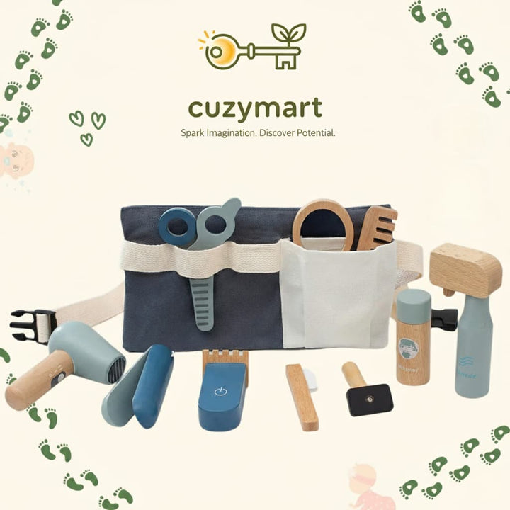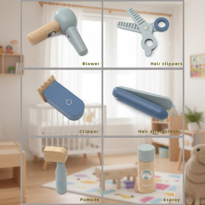 - Set Includes: Wooden hairdryer, scissors, comb, clippers, and additional barber accessories